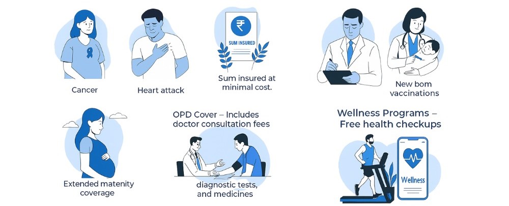 Some policies offer health check-ups, wellness programs, and maternity cover.