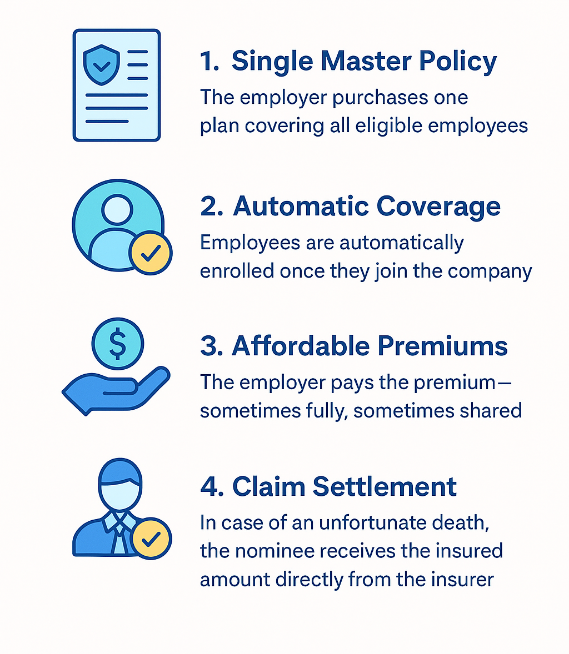 Employees are automatically covered under the group policy — no medical tests or complex paperwork required (in most cases).